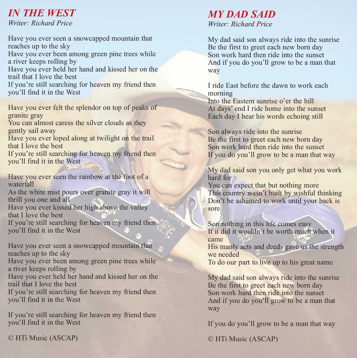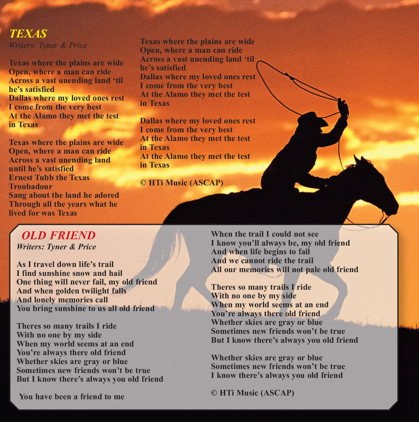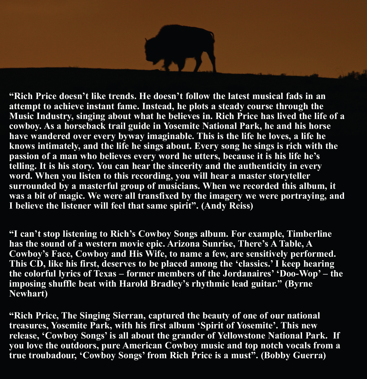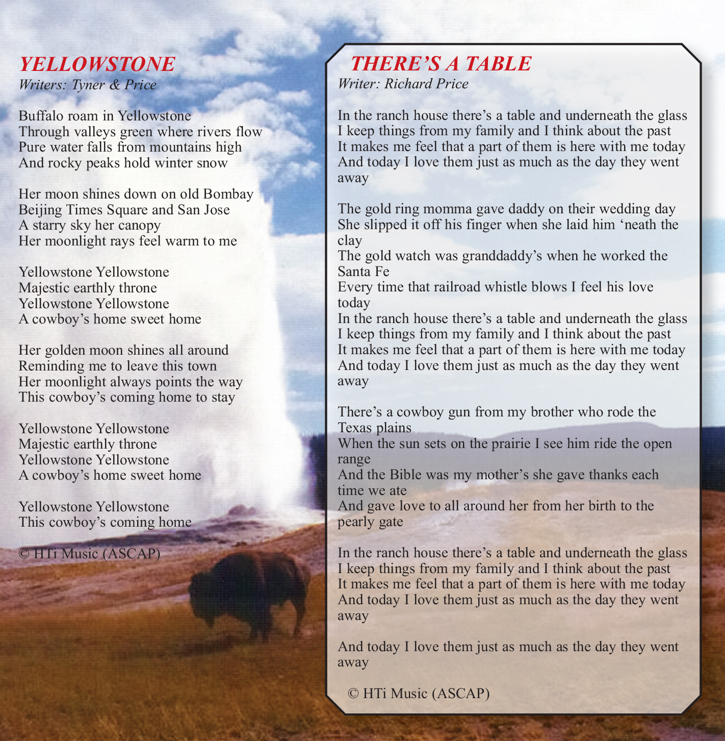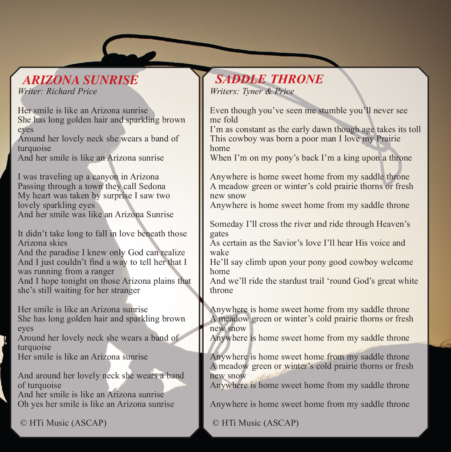 Cowboy Songs Sample Tracks 1. Yellowstone /wp-content/uploads/01-Yellowstone.mp3 2. There’s A Table /wp-content/uploads/02-Theres-A-Table.mp3 3. Old Friend /wp-content/uploads/03-Old-Friend.mp3 4. Texas /wp-content/uploads/04-Texas.mp3 5. Cowboy And His Wife /wp-content/uploads/05-Cowboy-And-His-Wife.mp3 6. Timberline /wp-content/uploads/06-Timberline.mp3 7. A Cowboy’s Face /wp-content/uploads/07-A-Cowboys-Face.mp3 8. Sierra Moon /wp-content/uploads/08-Sierra-Moon.mp3 9. In The West /wp-content/uploads/09-In-The-West.mp3 10. My Dad Said /wp-content/uploads/10-My-Dad-Said.mp3 11. Saddle Throne /wp-content/uploads/11-Saddle-Throne.mp3 12. Arizona Sunrise /wp-content/uploads/12-Arizona-Sunrise.mp3 Get the Album