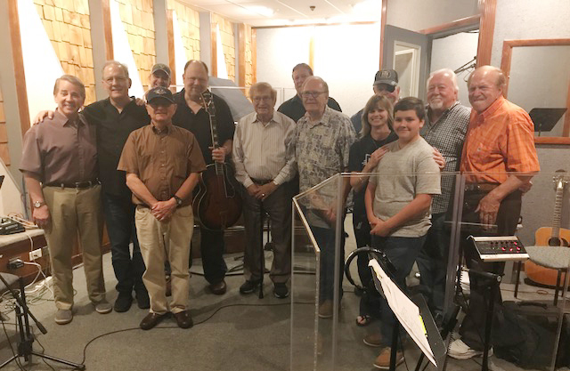 Rich poses for a group photo at Hilltop Studio with Nashville’s legendary session players: (left to right) Joey Miskulin (Musicians’ Hall of Fame, Accordion, “Riders In The Sky”), Bob Mater (Drums), Brad Albin (Bass), Charlie McCoy (Country Music Hall of Fame, Harp, Vibes), Andy Reiss (Guitar, “Time Jumpers”), Harold Bradley (Country Music Hall of Fame, Guitar), Jim “Moose” Brown (Producer, Songwriter, Guitarist), Tom Pick and Harrison Tyner (Producers), Jimmy Capps (Musicians’ Hall of Fame, Guitar), and Michelle Capps (Vocalist, Recording Artist), and family.