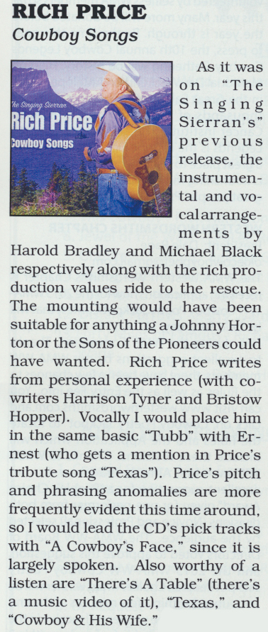 Again, a million thank you’s to our dear DJ friends at the Western Music Association radio stations, and to their wonderful family of listeners for making our new album, “Cowboy Songs,” Rich Price, The Singing Sierran, the number 17 album in the Top 30 Cowboy/Western Albums chart, published in the Western Way, Winter 2016 issue.